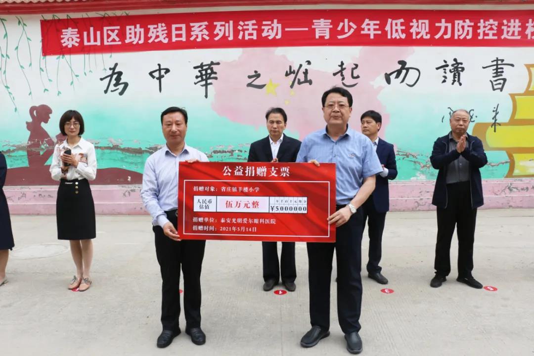 ? ? ? ? 5月14日上午,泰安光明愛爾眼科醫(yī)院數(shù)十位醫(yī)護(hù)人員攜帶相關(guān)設(shè)備與低視力防控產(chǎn)品,驅(qū)車趕往位于泰安市泰山區(qū)省莊鎮(zhèn)的羊樓小學(xué),開展青少年低視力防控進(jìn)校園活動(dòng)。 ? ? ? ? ?此次活動(dòng)是泰山區(qū)殘聯(lián)舉行助殘日系列活動(dòng)的其中一站,是一項(xiàng)以低視力防控、眼健康科普為主要宗旨,以降低校園內(nèi)近視發(fā)生率,呵護(hù)學(xué)生眼健康為目標(biāo)的公益助學(xué)活動(dòng)。 ? ? ? ? ?泰安市殘聯(lián)四級(jí)調(diào)研員李廣喜、泰山區(qū)政府分管領(lǐng)導(dǎo)范玉文、泰安光明愛爾眼科醫(yī)院CEO楊敬昌、泰山區(qū)殘聯(lián)理事長孫超、副理事長劉勝華,省莊鎮(zhèn)副鎮(zhèn)長馬紅、省莊鎮(zhèn)教育委員會(huì)黨委副書記馬長榮,羊樓小學(xué)校長趙光明以及區(qū)殘聯(lián)、愛爾眼科部分醫(yī)護(hù)人員及羊樓小學(xué)教職工和學(xué)生參加此次活動(dòng)。活動(dòng)由泰山區(qū)殘聯(lián)黨組書記劉長順主持。